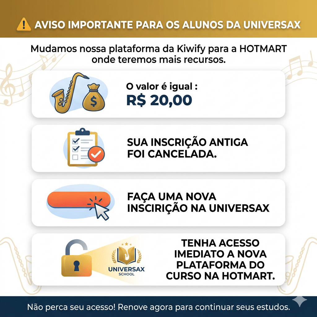 O maior erro de quem começa no Sax é tentar aprender sozinho, você sopra, o som sai rachado e você não sabe o porquê. É por isso que na Universax eu não te dou só aula gravada, eu te dou meu WhatsApp.